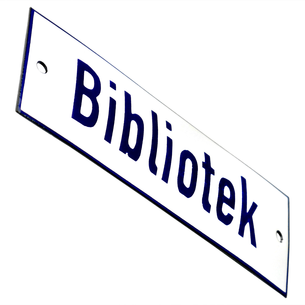 Emaljskylt Bibliotek vit - blå 15 x 5 cm modell 1-3